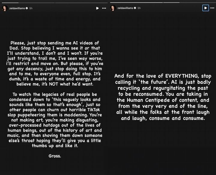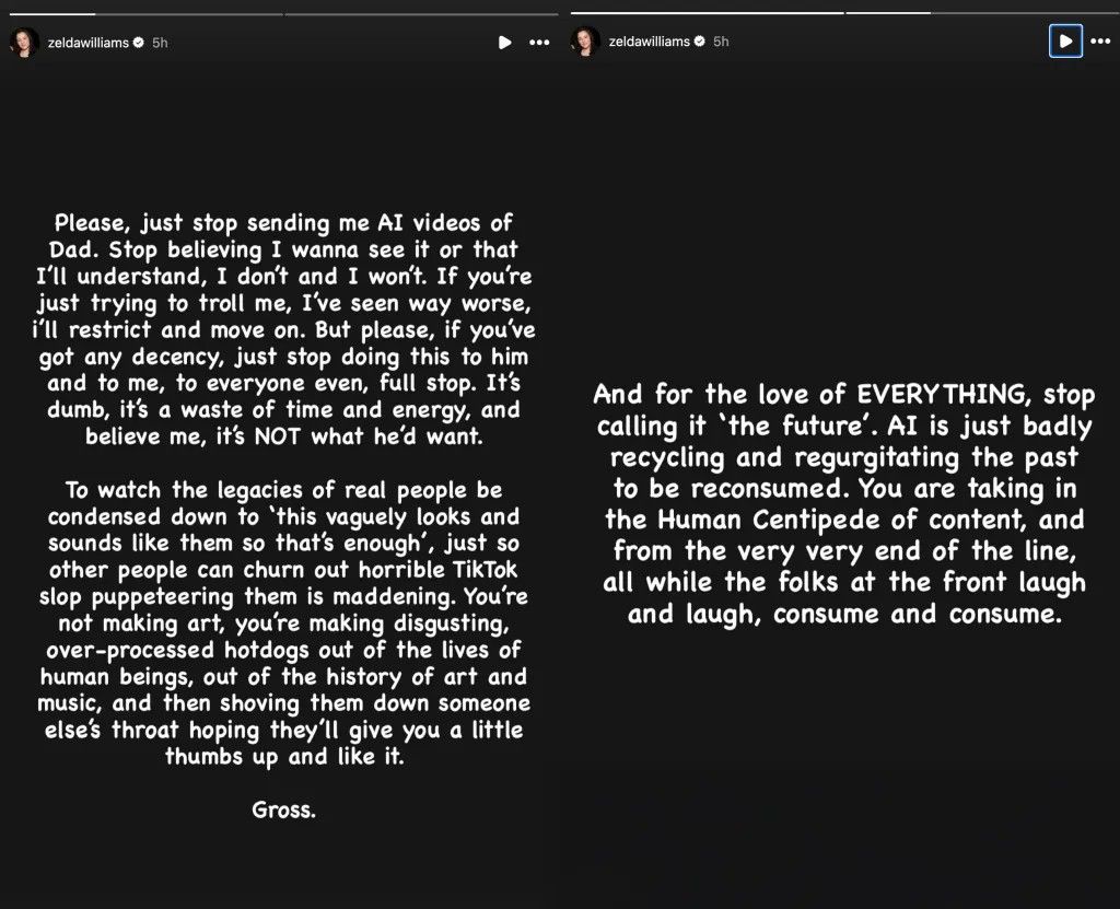 Następnie skrytykowała cały proceder tworzenia wideo AI ze zmarłymi aktorami. Zelda stwierdziła, że do szału doprowadza wykorzystywanie dziedzictwa danych osób w wygenerowanych nagraniach AI, gdzie postacie przypominające na przykład artystów i brzmiące jak oni, zachowują się niczym kukiełki do zabawiania ludzi na TikToku.