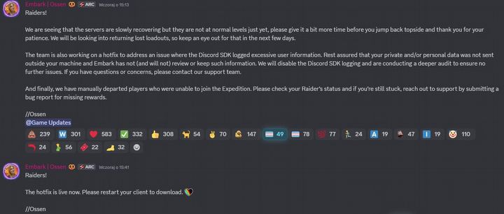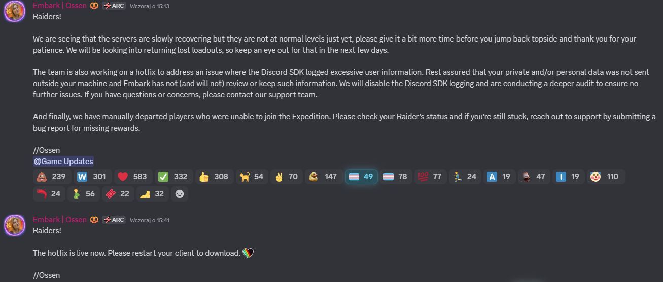 Zespół pracuje również nad hotfiksem, który rozwiąże problem polegający na tym, że Discord SDK zapisywał w logach nadmierną ilość informacji o użytkowniku. Zapewniamy, że Twoje prywatne i/lub osobiste dane nie zostały wysłane poza Twój komputer, a Embark nie przeglądało i nie będzie przeglądać ani przechowywać takich informacji. Wyłączymy logowanie przez Discord SDK i przeprowadzamy dokładniejszy audyt, aby upewnić się, że nie występują żadne dodatkowe problemy. Jeśli masz pytania lub wątpliwości, skontaktuj się z naszym zespołem wsparcia.