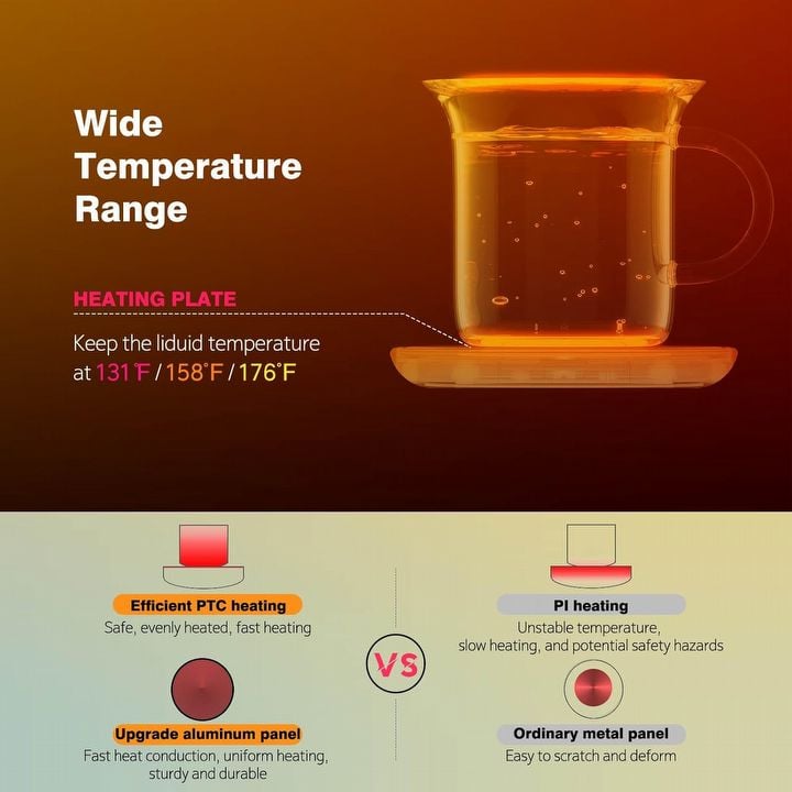 Rano kawę w kubku piję nawet 2 godziny i trzymam ją na podgrzewaczu w temperaturze 80 stopni, gdyż kubek ma małe dno i nie przylega płasko do podgrzewacza. Kawa jest cały czas bardzo ciepła – idealna! Potem robię duży dzbanek herbaty, który ma płaskie dno przylegające do podgrzewacza, i podgrzewam go do 55 stopni, i jest prawie za gorący do picia przez wiele godzin. Wspaniałe urządzenie w zimnej porze roku! Ma wiele ustawień czasu wyłączenia, więc jest bezpieczne.