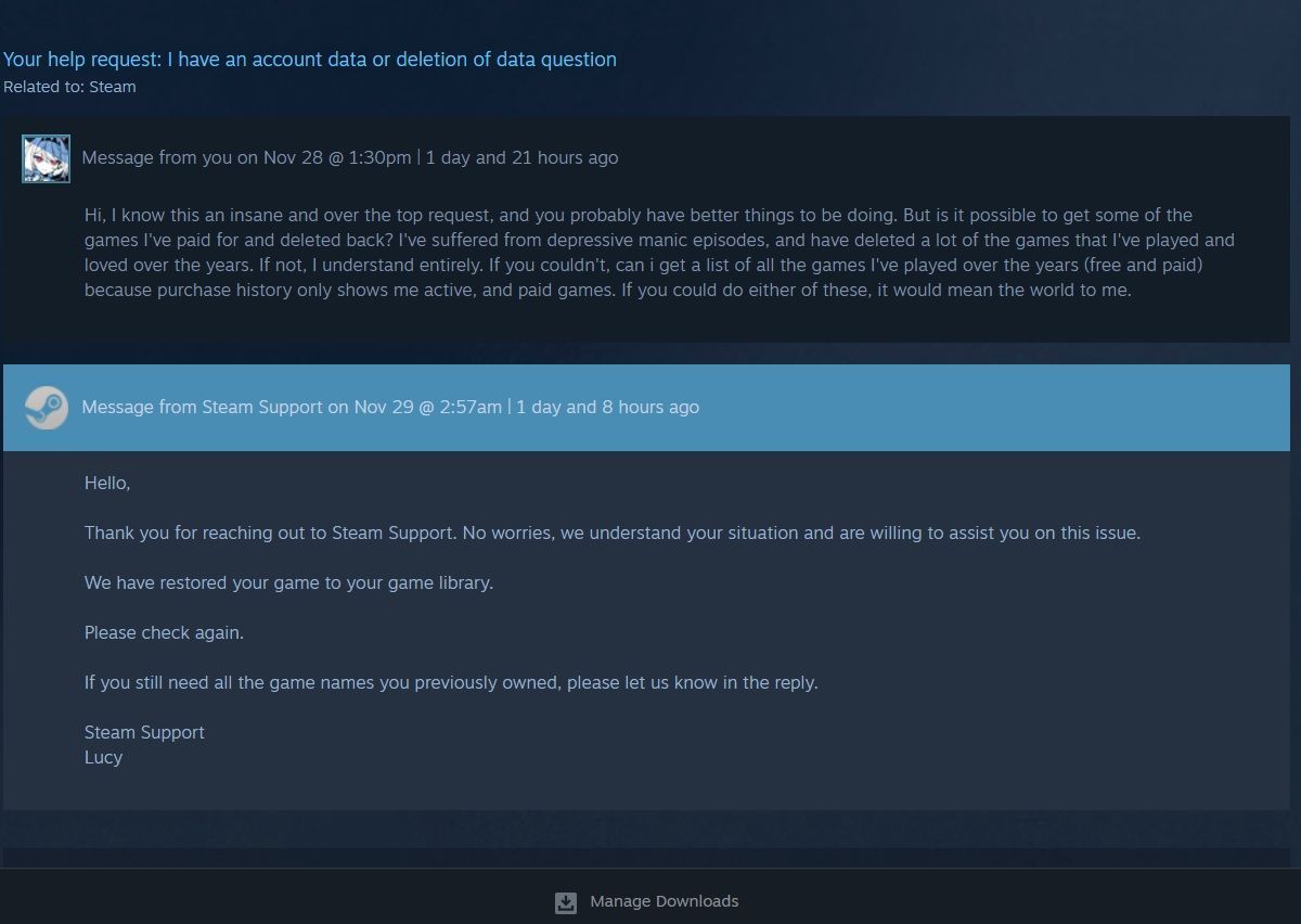 Wątek rozpoczyna wpis na Reddicie, którego autor postanowił podzielić się sympatyczną rozmową z działem wsparcia Steama. Zmagający się z depresją i epizodami maniakalnymi gracz zapytał o możliwość przywrócenia gier permanentnie usuniętych z jego konta w przypływie emocji bądź o podanie listy skasowanych tytułów tak, by mógł je odzyskać we własnym zakresie. Prosta odpowiedź supportu udowodniła, jak istotne w tym przemyśle jest człowieczeństwo i zrozumienie potrzeb klienta.
