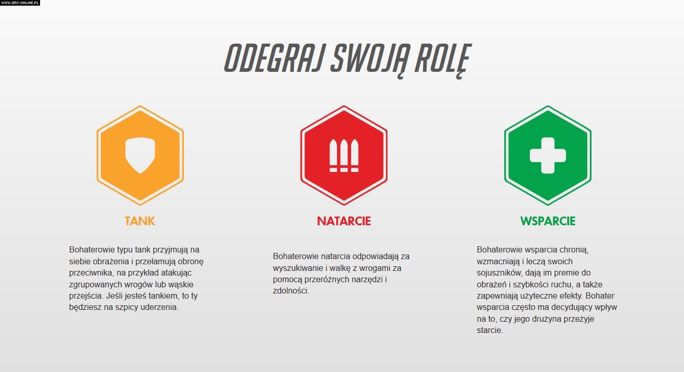 Do tej pory poznaliśmy imiona oraz charakterystykę 31 grywalnych bohaterów. Każdy z nich wyposażony jest w unikalne dla siebie uzbrojenie i umiejętności oraz przydzielony został do jednej z trzech specjalizacji (Tank, Natarcie, Wsparcie). Dzięki zróżnicowaniu herosów gracze mogą stosować różnorodne strategie, a także łączyć poszczególne zdolności członków drużyny, otrzymując ciekawe i efektywne kombinacje.