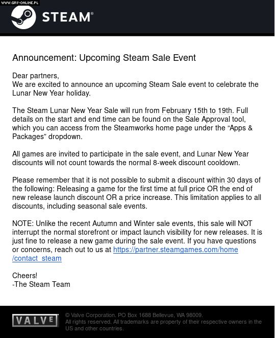 Mamy końcówkę stycznia, nasze karty kredytowe jeszcze nie miały okazji na dobre odetchnąć po szaleństwie świątecznych promocji, a wygląda na to, że już wkrótce ponownie pójdą w ruch. W serwisie Reddit użytkownik ukrywający się pod pseudonimem zerfgog opublikował mail, jaki wystosowali do swoich partnerów przedstawiciele firmy Valve. Informują w nim, że 15 lutego, czyli za nieco ponad trzy tygodnie, na platformie Steam rozpocznie się kolejna wyprzedaż, organizowana z okazji Chińskiego Nowego Roku. Lunar New Year, gdyż tak nazwane zostało to wydarzenie, potrwa cztery dni i zakończy się 19 lutego. Konkretne godziny nie są znane (przynajmniej dla graczy), lecz możemy przypuszczać, że tradycyjnie promocja rozpocznie się o 19:00 czasu polskiego.