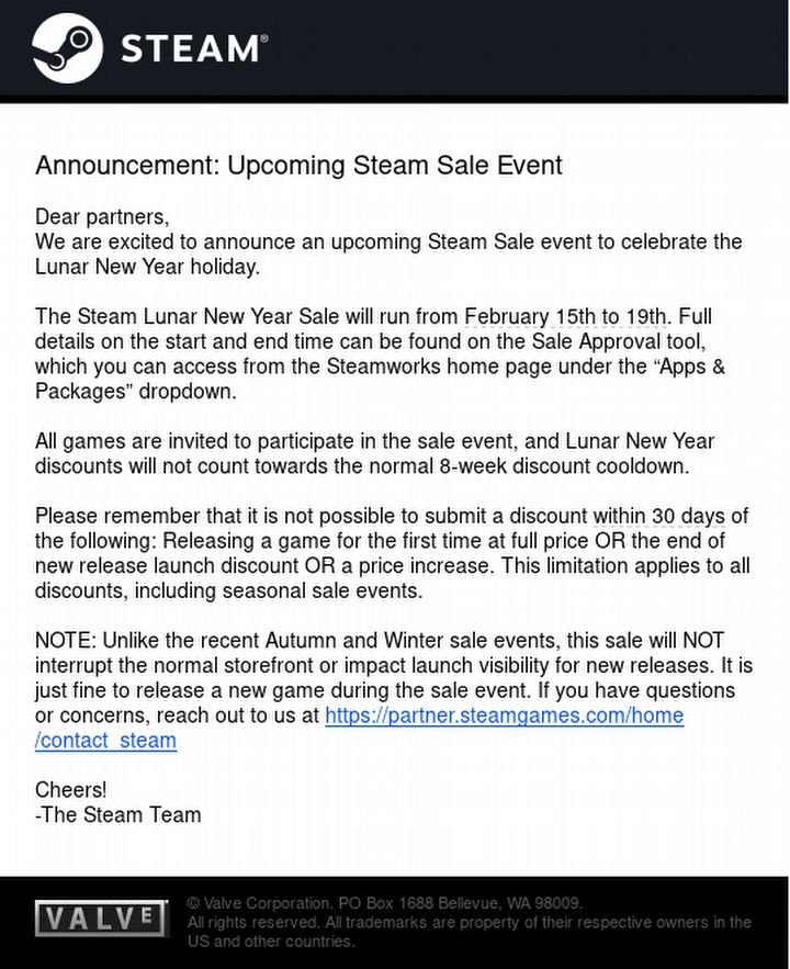 Według powyższego tekstu, do udziału w wyprzedaży Lunar New Year zaproszeni są wszyscy wydawcy. Oznacza to, że nie obowiązuje zwyczajowo wymagana ośmiotygodniowa przerwa pomiędzy kolejnymi obniżkami cen poszczególnych produktów. Podczas nadchodzącej promocji, w przeciwieństwie do jesiennej i zimowej, będzie można również bez większych komplikacji wydać nową grę.