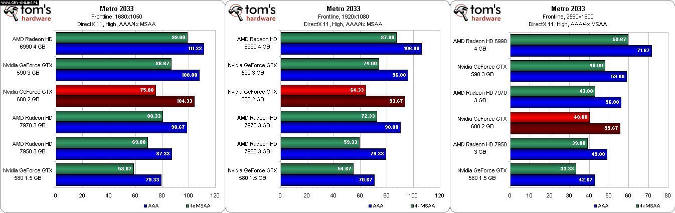 Karta trafi do sprzedaży 22 marca, czyli jutro. Patrząc na poniższe benchmarki możecie się przekonać jaką wydajność oferuje najnowsze dzieło Nvidii w grach takich jak Battlefield 3, Metro 2033, DiRT 3 i Crysis 2. Nie zapomniano też o teście w programie 3DMark 2011.