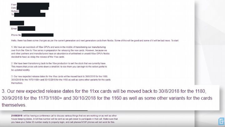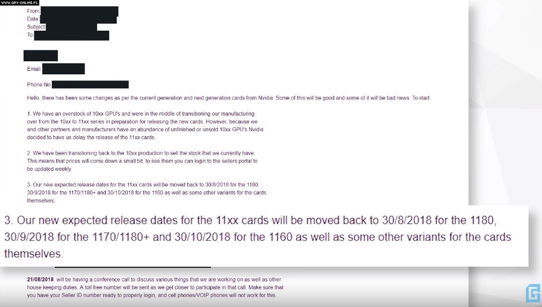 Z maila wynika, że partnerzy AiB Nvidii mają nadmiar zapasów kart graficznych z serii 10XX i już przechodzą na produkcje nowych modeli, aby przygotować się na ich premierę. W związku obfitością nieukończonych i niesprzedanych egzemplarzy z dziesiątej generacji, Nvidia postanowiła opóźnić publikację nowych kart. Aby sprzedać „zalegające” w magazynach GeForce’y 10XX, producenci mogą zdecydować się na lekkie obniżenie cen, które powinno być wkrótce widoczne w sklepach.