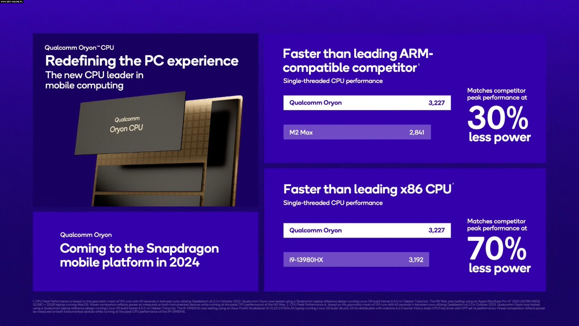 Zgodnie z oczekiwaniami firma zaprezentowała również procesor dla urządzeń mobilnych Snapdragon X Elite. Nadchodzący układ został wyposażony w 12 rdzeni Oryon pracujących z częstotliwością 3.80 GHz. Warto zaznaczyć, że procesor opiera się na architekturze ARM zamiast na x86 tak jak dostępne na rynku czipy od AMD czy Intela.
