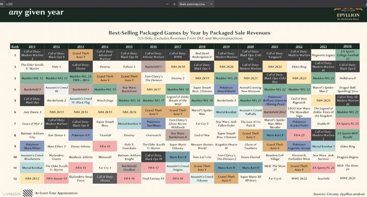W wielu przypadkach takie wydatki przez długi czas przynosiły rezultaty. W raporcie znalazła się również ciekawa infografika (znajdziecie ją poniżej), pokazująca jakie gry w każdym roku przynosiły najwięcej przychodów ze sprzedaży w USA. Poszczególnym markom przyznano odrębne kolory i dzięki temu obrazek pokazuje, jak mocno trzymają się popularne serie.