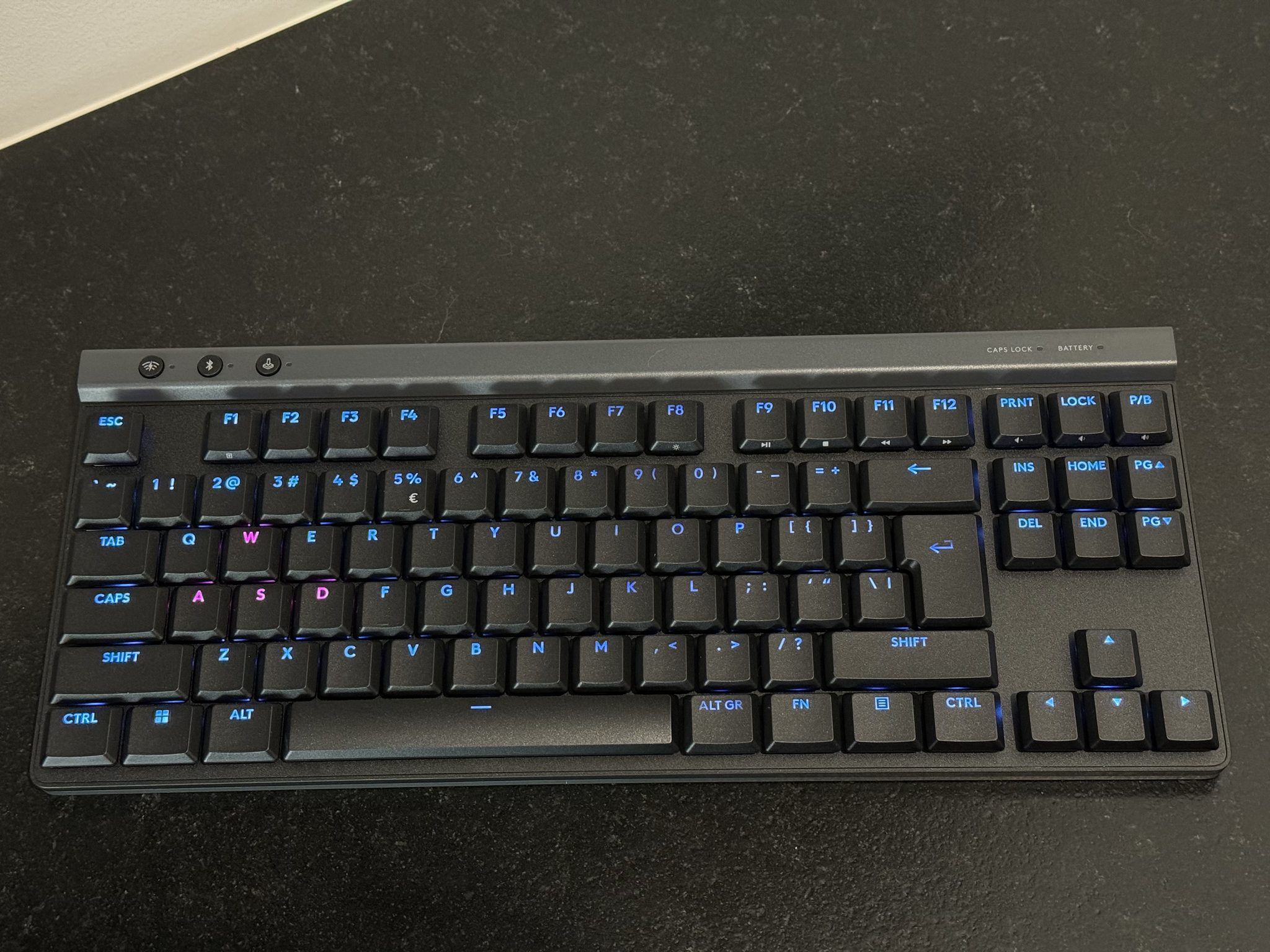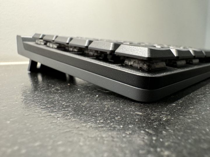 Sama klawiatura prezentuje się świetnie. Wszystko jest idealnie spasowane, a materiał obudowy jest wysokiej jakości. To nie jest segment premium, więc nie dostaniemy tutaj metalu – ten znajdziemy np. w G915 TKL – ale i tak wrażenia są bardzo pozytywne. Klawiatura jest też dość ciężka jak na swoje niewielkie wymiary – 880 gramów dopełnia tu wrażenia, że mamy do czynienia z kawałem solidnego sprzętu, a nie pustą „wydmuszką” z najtańszego plastiku.