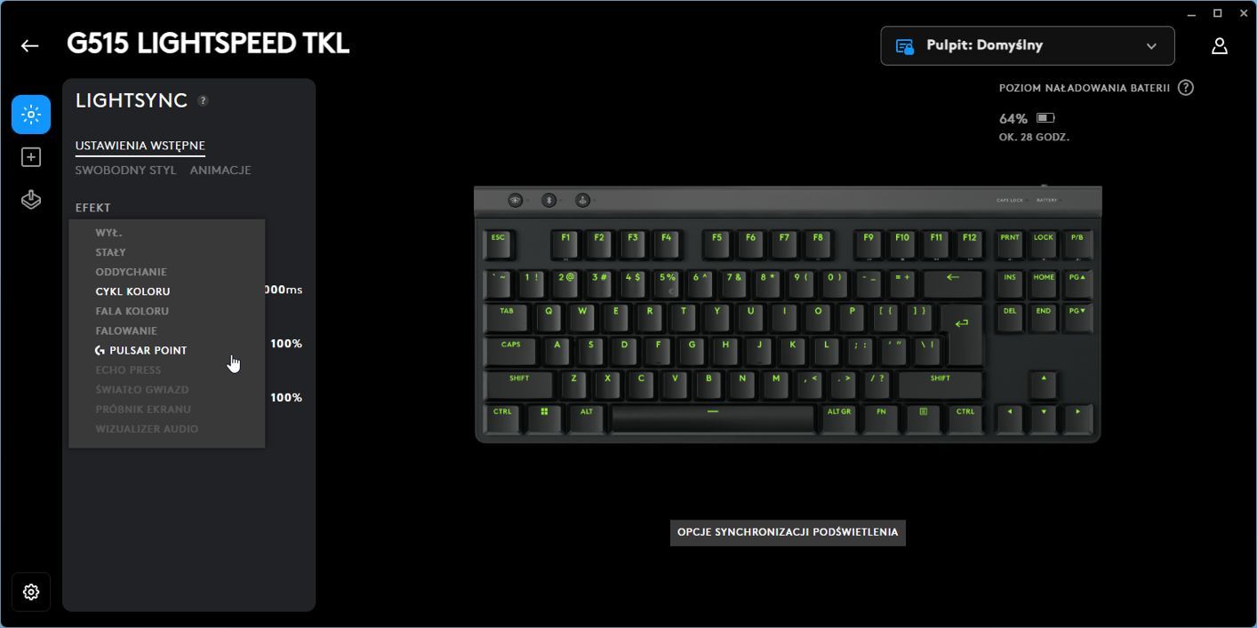 W przypadku modelu G515 do dyspozycji mamy całkiem sporo ustawień związanych z podświetleniem – w końcu modyfikować możemy kolor każdego klawisza, a także wybierać spośród całkiem pokaźnego katalogu trybów i efektów.