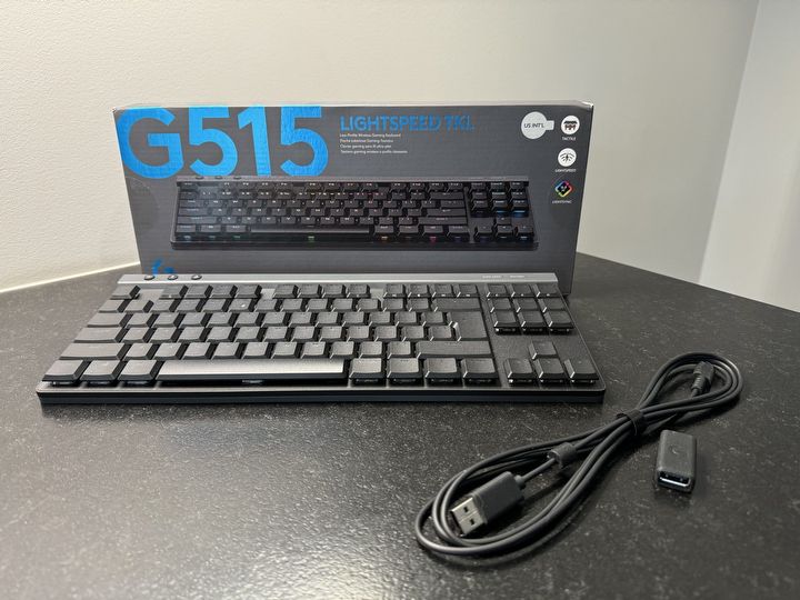 Logitech G515 sprzedawany jest w zestawie z kablem o długości 1,8 metra zakończonym z jednej strony USB-A, z drugiej USB-C. W pudełku znajdziemy także niewielki odbiornik bezprzewodowy USB-A, a także przedłużacz USB.