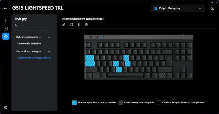 Możemy także zmienić działanie lub przypisać dodatkowe skróty klawiszowe dla praktycznie każdego klawisza (z wyjątkiem Fn, F1, F8). Tryb gry także może być przydatny – pozwoli wyłączyć wybrane przez nas klawisze, które mogłyby wybić nas z rytmu w czasie gry. Domyślnie jest to np. przycisk Windows, ale nic nie stoi na przeszkodzie, aby wybrać inne, które mogą nam przeszkadzać w trakcie gry.