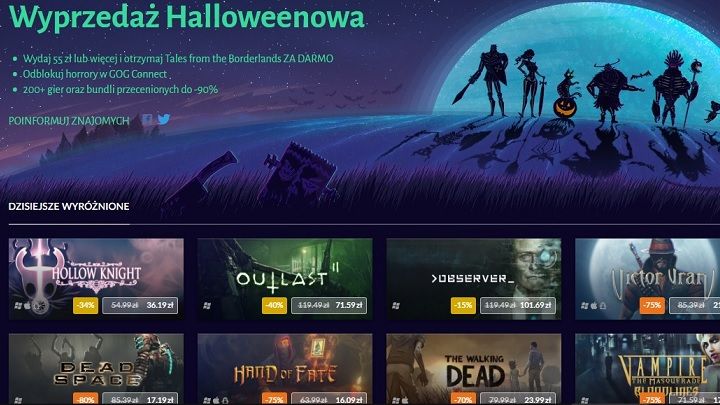 Halloween zbliża się wielkimi krokami, toteż jak co roku na platformie GOG.com wystartowała halloweenowa wyprzedaż, która zakończy się drugiego listopada o 23:00. Tym razem promocje obejmują ponad dwieście gier i pakietów, przecenionych nawet o 90%. Dodatkową zachętę do zrobienia zakupów stanowi również fakt, że każdy, kto w okresie wyprzedaży wyda na GOG-u przynajmniej 55 zł, otrzyma za darmo Tales from the Borderlands: A Telltale Games Series.