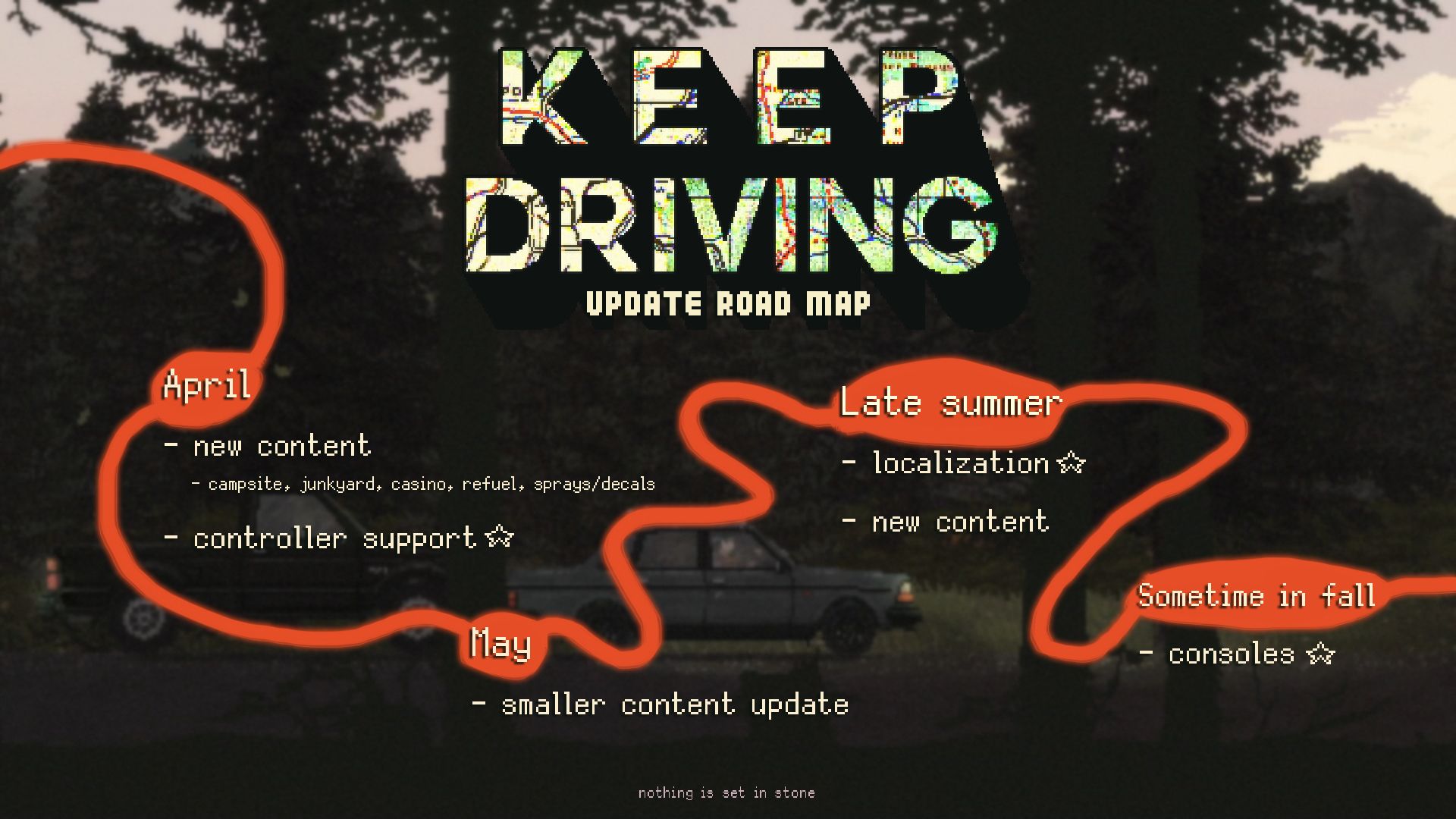 Zanim jednak Keep Driving zaparkuje na konsolach, na graczy czeka po drodze jeszcze kilka innych atrakcji. Oto kluczowy plan działania deweloperów na 2025 roku (nie obejmuje on poprawek błędów):