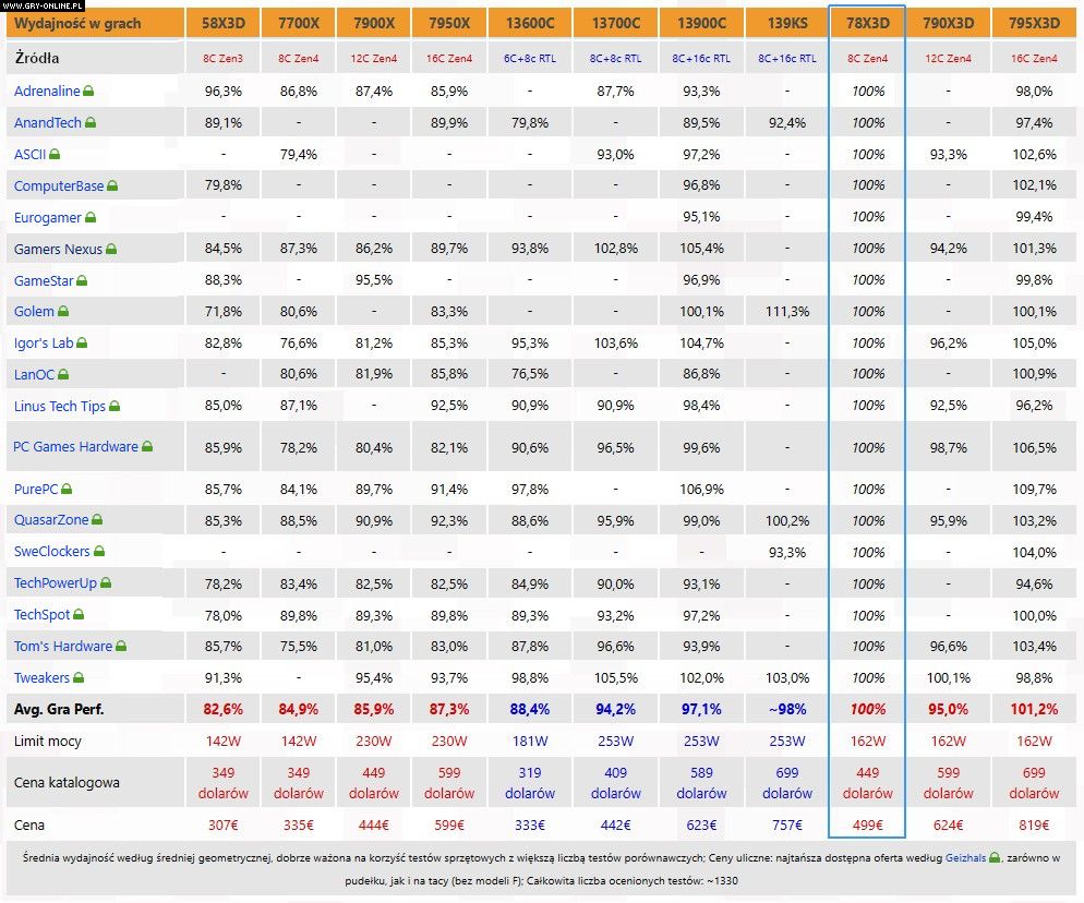 Ryzen 7 7800X3D najprawdopodobniej okaże się łakomym kąskiem dla bardziej wymagających graczy dzięki wysokiej wydajności połączonej z umiarkowanym apetytem na energię i niewygórowaną ceną. Jeśli jesteście zainteresowani nabyciem procesora, to poniżej znajdziecie jego koszt w Polsce: