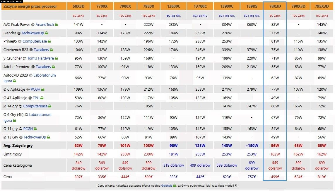 Nie inaczej jest tym razem – jak widać powyżej, Ryzen 7 7800X3D potrafi w grach dotrzymywać kroku Intelowi Core i9-13900K/KS. A to przecież jest układ z wyższej półki, znacznie potężniejszy i droższy. Największe różnice są widoczne w zużyciu energii przez procesor, którego moc chwilowa przekracza 200 W (średnio 150 W). Tymczasem testowany Ryzen 7 zadowala się wartościami dwucyfrowymi, co widać po poniższej tabeli: