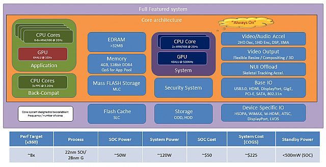 Ujawniona prezentacja datowana jest na połowę 2010 roku i raczej trudno oczekiwać, by opisana w niej specyfikacja techniczna w stu procentach odpowiadała temu, co znajdzie się w nowej konsoli Microsoftu. Według założeń, sercem Xboksa 720 miałby być 6-8 rdzeniowy procesor ARM/Intel x86, a za wyświetlanie grafiki odpowiadałby dedykowany układ taktowany zegarem 1.0 GHz. Przewidywana ilość pamięci RAM wynosiłaby 4GB. Urządzenie miałoby też dysponować odrębnymi układami odpowiedzialnymi m.in. za pracę systemu i wsteczną kompatybilność z Xboksem 360. Za napęd optyczny posłużyłby czytnik płyt Blu-ray. Nie zabrakłoby również modemu 4G pracującego w standardzie LTE lub WiMAX.