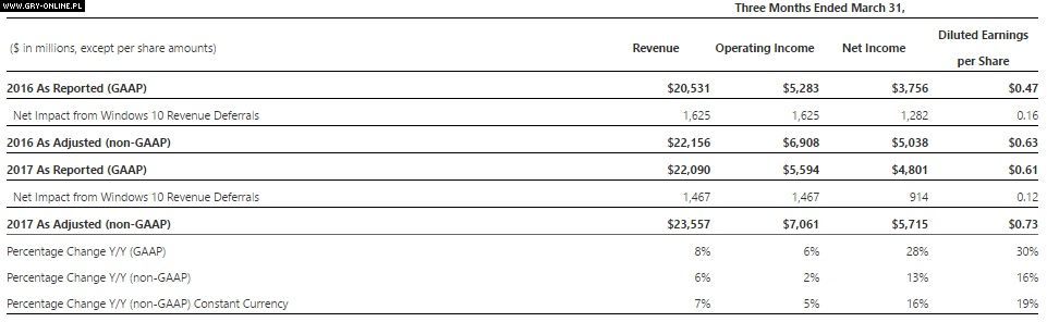 Firma Microsoft opublikowała raport finansowy za okres od 1 stycznia do 31 marca 2017 roku. Gigant jako całość jest na sporym plusie, a dodatkowo odnotował wzrost przychodów z branży gier wideo o 4%.