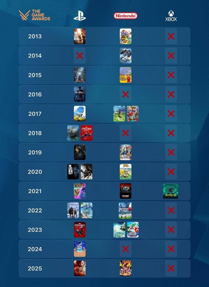 Dziś na subreddicie r/gaming pojawił się bardzo ciekawy post autorstwa użytkownika „Ftouh_Shala”. W rzeczonej publikacji została zamieszczona lista prezentująca growe hity od konsolowych gigantów w postaci: Sony, Nintendo oraz Xboxa. Wystarczy jeden rzut oka, aby się przekonać, że od 2013 roku Microsoft nie miał specjalnie, czym się pochwalić na TGA, a jedyną grą „zielonych”, która uzyskała nominację do tytułu „Gry Roku” było Psychonauts 2 w 2021 roku. Oznacza to, że na 13 gal The Game Awards Microsoft doczekał się tylko jednej nominacji, kiedy hity od Sony zanotowały 12, a od Nintendo 10 nominacji.
