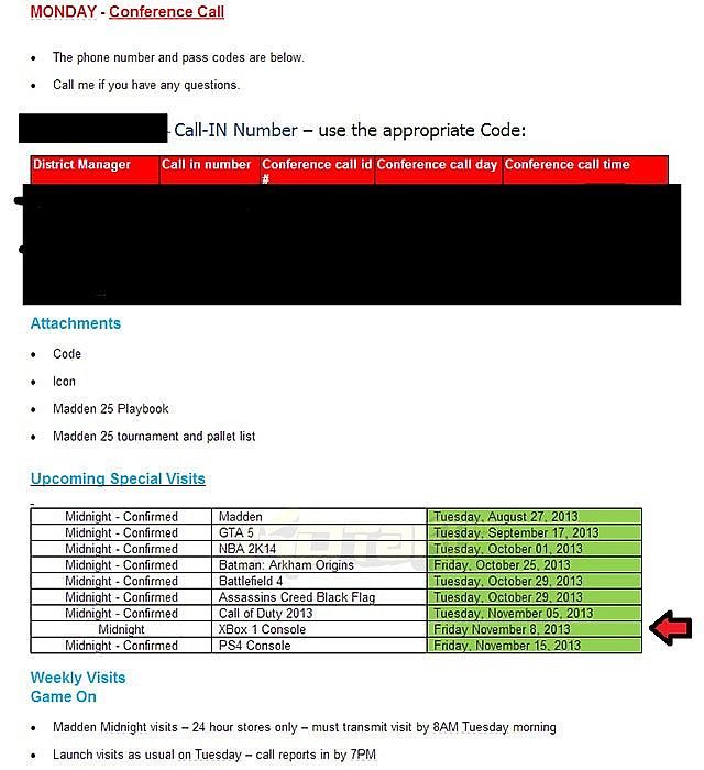 Najnowszą ze spekulacji przedstawił serwis Kotaku, według którego konsola zadebiutuje w USA 8 listopada 2013 roku, czyli na tydzień przed pojawieniem się PlayStation 4 na tym rynku. Na wykazie planowanych przez amerykańską sieć sklepów Walmart imprez premierowych, pośród między innymi Grand Theft Auto V (17 września tego roku), figuruje pozycja „Xbox 1 Console”. Informację tą dostarczył pracownik firmy, odpowiedzialny za podpisywanie umów marketingowych.