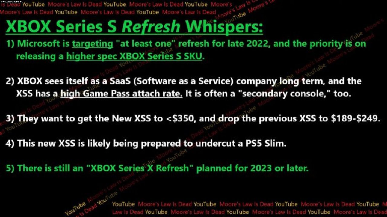 Nie minął rok od premiery konsol dziewiątej generacji – prawdziwie next-genowych tytułów jest mało i żaden nie wycisnął z konsol Sony czy Microsoftu wszystkich soków. Tymczasem według źródeł youtubera prowadzącego kanał Moore's Law Is Dead (patrz wideo poniżej – fragment dotyczący XSS rozpoczyna się w 13:38), obydwie firmy mogą mieć w planach odświeżone wersje swoich sprzętów. Pierwsza z nich, to jest ulepszona wersja Xboksa Series S, miałaby się pojawić na rynku pod koniec przyszłego roku.
