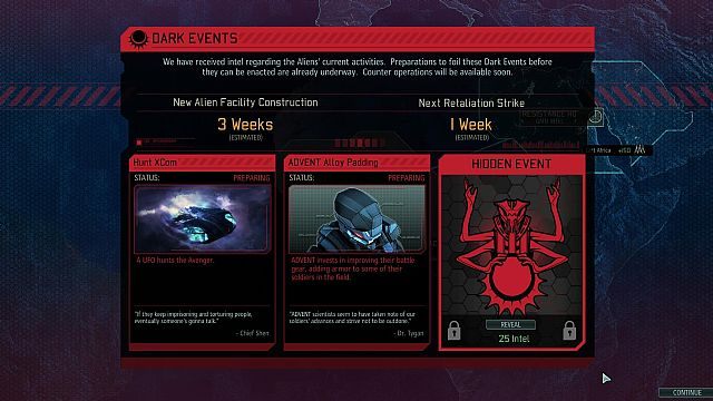 Z mapą świata związane jest tez pewne novum w rozgrywce – system Dark Events. Najprościej rzecz ujmując, są to akcje organizacji ADVENT, która oprócz głównego celu (znów – do odkrycia przez graczy) mogą zdecydować się na podjęcie innych działań, które wpłyną na rozgrywkę (DeAngelis wspomniał o opracowaniu lepszych pancerzy dla wrogich żołnierzy oraz polowaniu na nasz statek). Część z nich będzie trzeba odblokować przez pozyskanie odpowiednich danych wywiadowczych, co pozwoli graczom na podjęcie odpowiednich przeciwdziałań. Co istotne, DeAngelis z góry zaznaczył, że nie będzie możliwe zapobiegnięcie wszystkim tym akcjom. Więcej – powstrzymanie jednej inicjatywy wroga może prowadzić do kontrakcji obcych. Przykładowo wyjątkowo rozeźleni obcy mogą rzucić się w pogoń za Avengerem, a nawet zestrzelić nasz statek, co z kolei doprowadzi do specjalnej misji. Trzeba przy tym zaznaczyć, że zarówno Dark Events, jak i inne wydarzenia będą w sporej części losowe, co ma zmusić graczy do rewizji ich strategii przy kolejnych podejściach.