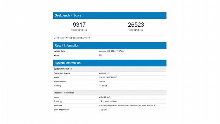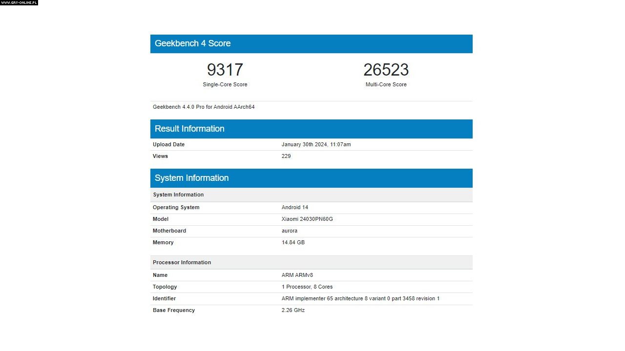Smartfon Xiaomi 14 Ultra kryje się w bazie Geekbench pod nazwą kodową Xiaomi 24030PN60G. W benchmarku Geekbench 4 telefon otrzymał 9317 punktów w teście pojedynczego rdzenia oraz wynik 26523 w sprawdzianie wielordzeniowym. Dla porównania, najnowszy Samsung Galaxy S24 Ultra osiągnął kolejno 9363 i 26019 punktów w tym samym badaniu. W obydwu przypadkach mowa o modelach, których sercem jest procesor Qualcomm Snapdragon 8 Gen 3.