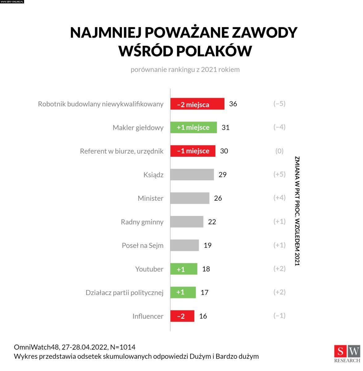 Co się tyczy wyników ankiety: influencerzy mogli odebrać politykom tytuł „najmniej szanowanego zawodu”, ale działacze partyjni, posłowie, radni gminni i ministrowie nadal znajdują się niemal na samym dole listy poważanych profesji.