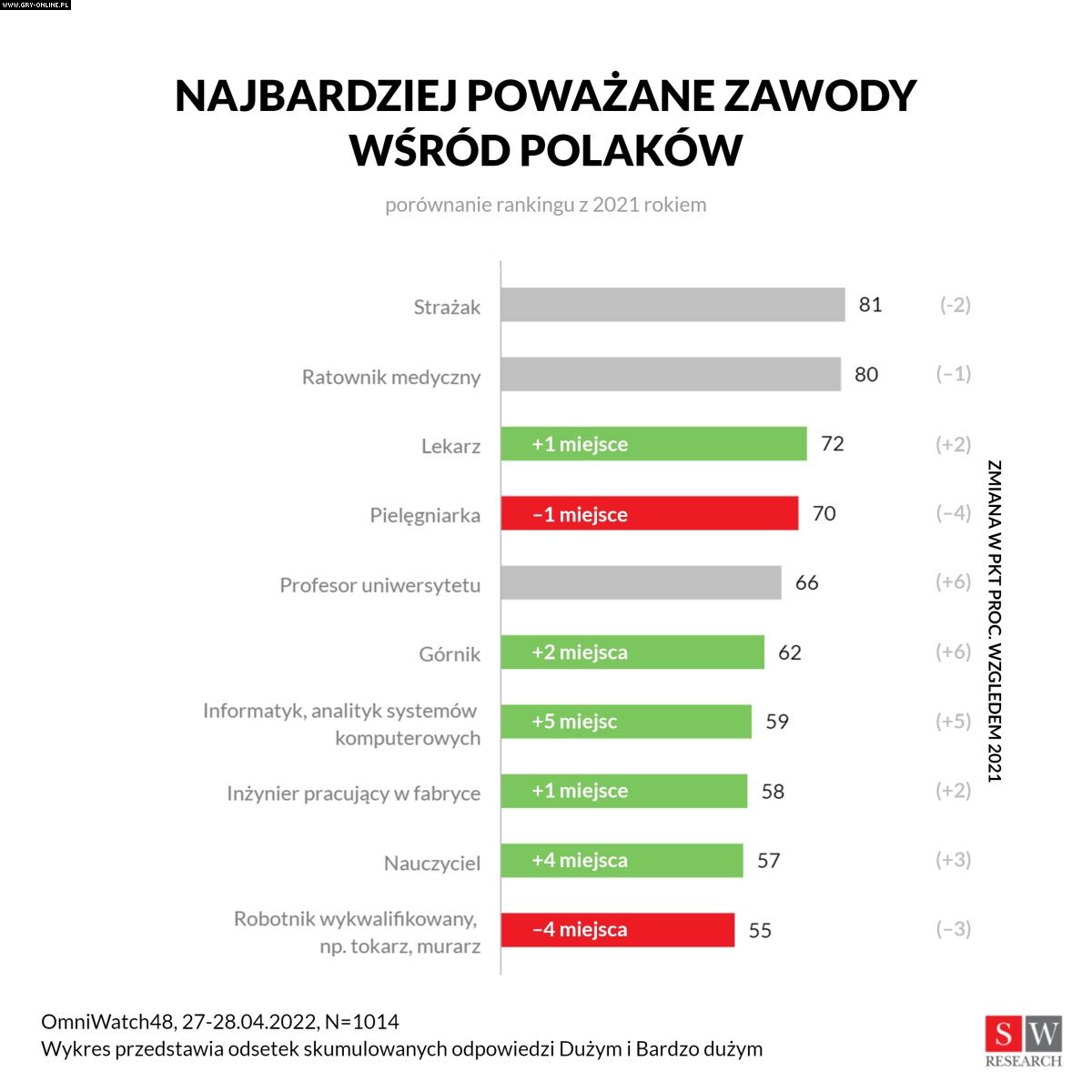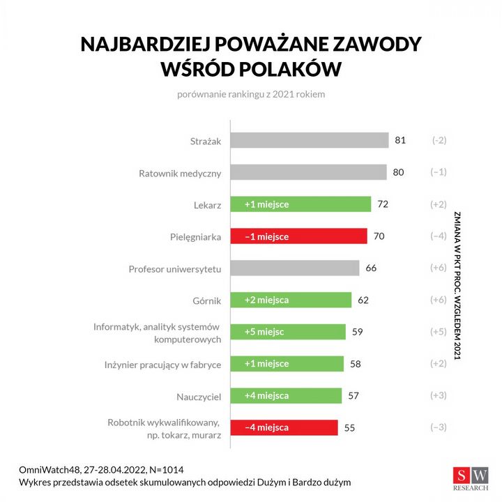 Większe poważanie zyskali informatycy, którzy skoczyli aż o pięć miejsc w zestawieniu (na siódmą pozycję). Ich pracę doceniło 59% ankietowanych. Jednak nadal daleko im do strażaków i pracowników medycznych, którzy cieszą się największym szacunkiem Polaków.