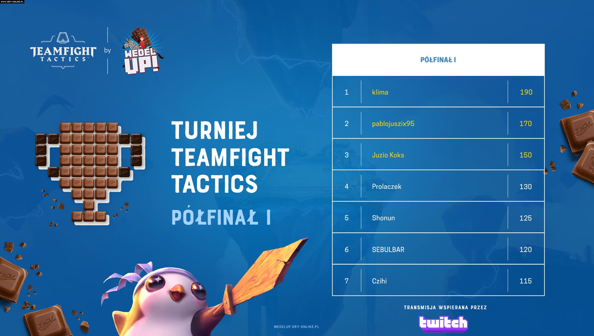 W zeszłą sobotę odbył się pierwszy półfinał w ramach turnieju Teamfight Tactics CUP by Wedel Up!. Poznaliśmy już trzech zawodników, którzy 21 grudnia powalczą w wielkim finale o pozostałe nagrody z puli 25 000 złotych oraz słodkie upominki od marki E.Wedel.