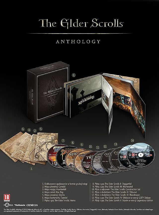 ZeniMax® Europe Limited oraz Cenega z przyjemnością informują, że już za tydzień, 18 października, w polskich sklepach dostępna będzie gra The Elder Scrolls Anthology. Po raz pierwszy w historii The Elder Scrolls® możesz zanurzyć się w świat tej wielokrotnie nagradzanej sagi za pośrednictwem jednej wspaniałej kolekcji. The Elder Scrolls® Anthology zawiera wszystkie pięć uznanych przez krytykę gier wraz z oficjalnymi dodatkami: The Elder Scrolls: Arena™, The Elder Scrolls II: Daggerfall™, The Elder Scrolls III: Morrowind® Game of the Year, The Elder Scrolls IV: Oblivion® Game of the Year i The Elder Scrolls V: Skyrim® Legendary Edition. Wszystko to w pięknym pudełku kolekcjonerskim. Znajduje się w nim również zestaw pięciu map przedstawiających Tamriel wraz z Zatoką Iliac, Morrowind, Cyrodiil oraz Skyrim. Dzięki tej niepowtarzalnej kolekcji poznasz serię, która zdefiniowała gry otwartego świata.