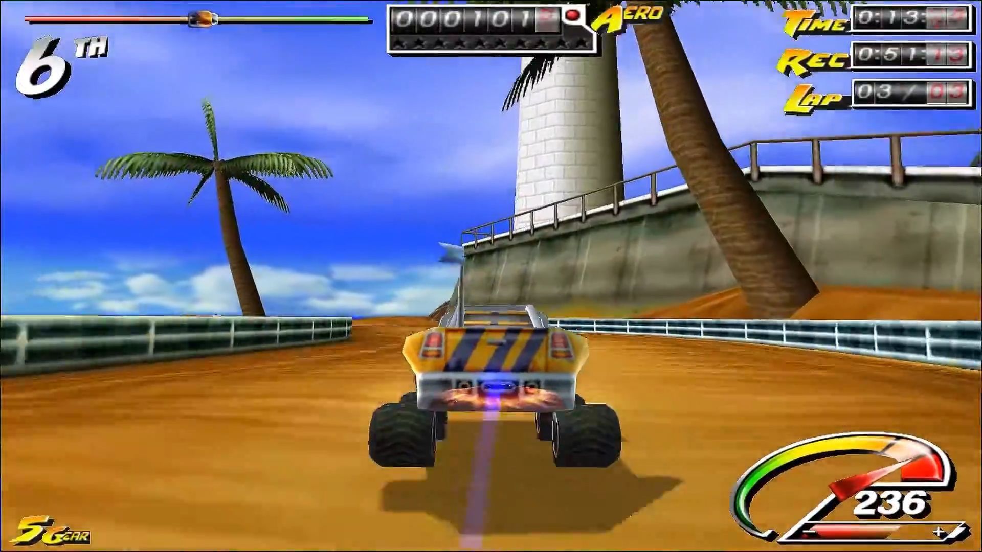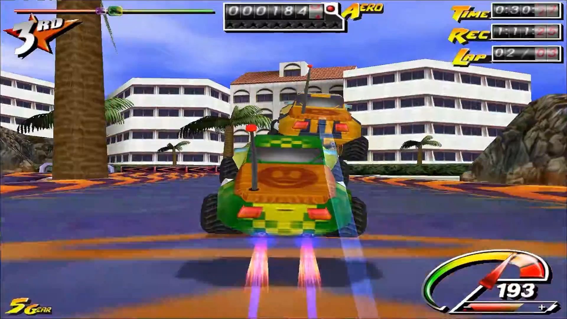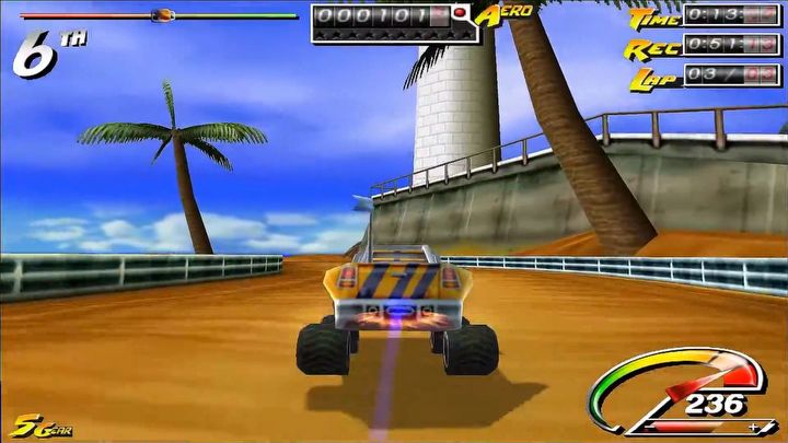 Druga opcja wiązała się z ryzykiem, ale bardziej nagradzała – mowa o akrobacjach, które stanowiły jedną z głównych atrakcji gry. Poprzez beczki i przewroty dokonane w locie. Raz, że nabijaliśmy punkty, a dwa, że nie wytracaliśmy prędkości – chyba że popis się nie udał i samochód wylądował na dachu. Liczyło się nasze wyczucie, jak i możliwości autka i przyznam, że przyjemnie podbijało to adrenalinę. Zwłaszcza że fizyka też pasowała do zabawowego tonu gry – przestrzelony wybryk potrafił katapultować nas z mapy, przez co mogliśmy zostać w tyle, a nadrabianie do łatwych nie należało (rubber banding, jeśli istniał, nie należał do przesadnie inwazyjnych, na ile pamiętam).