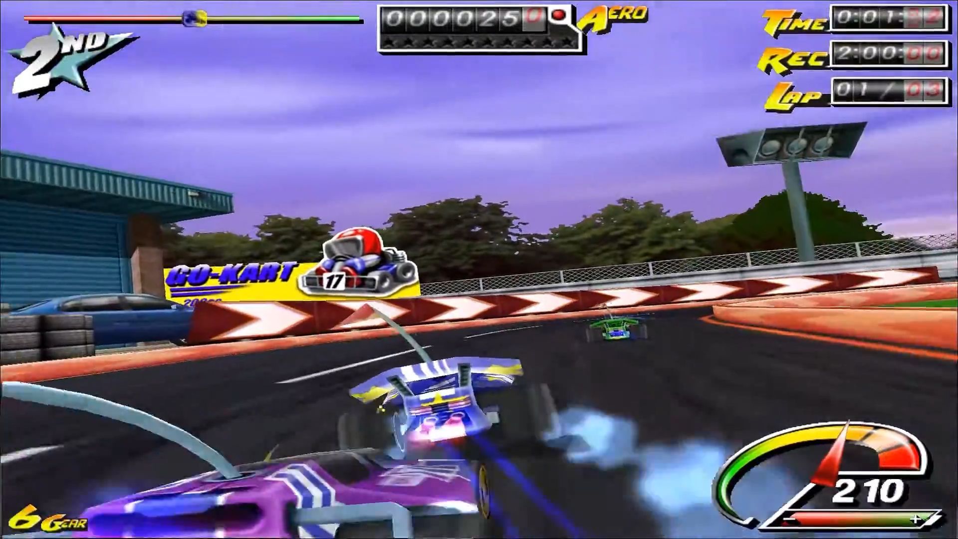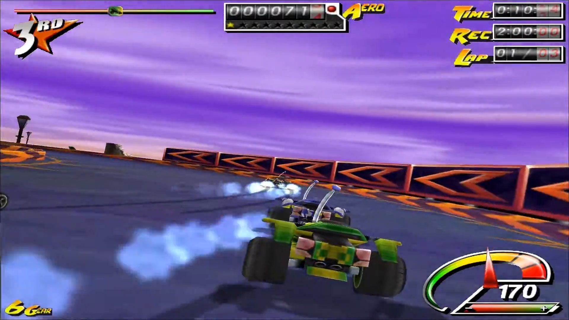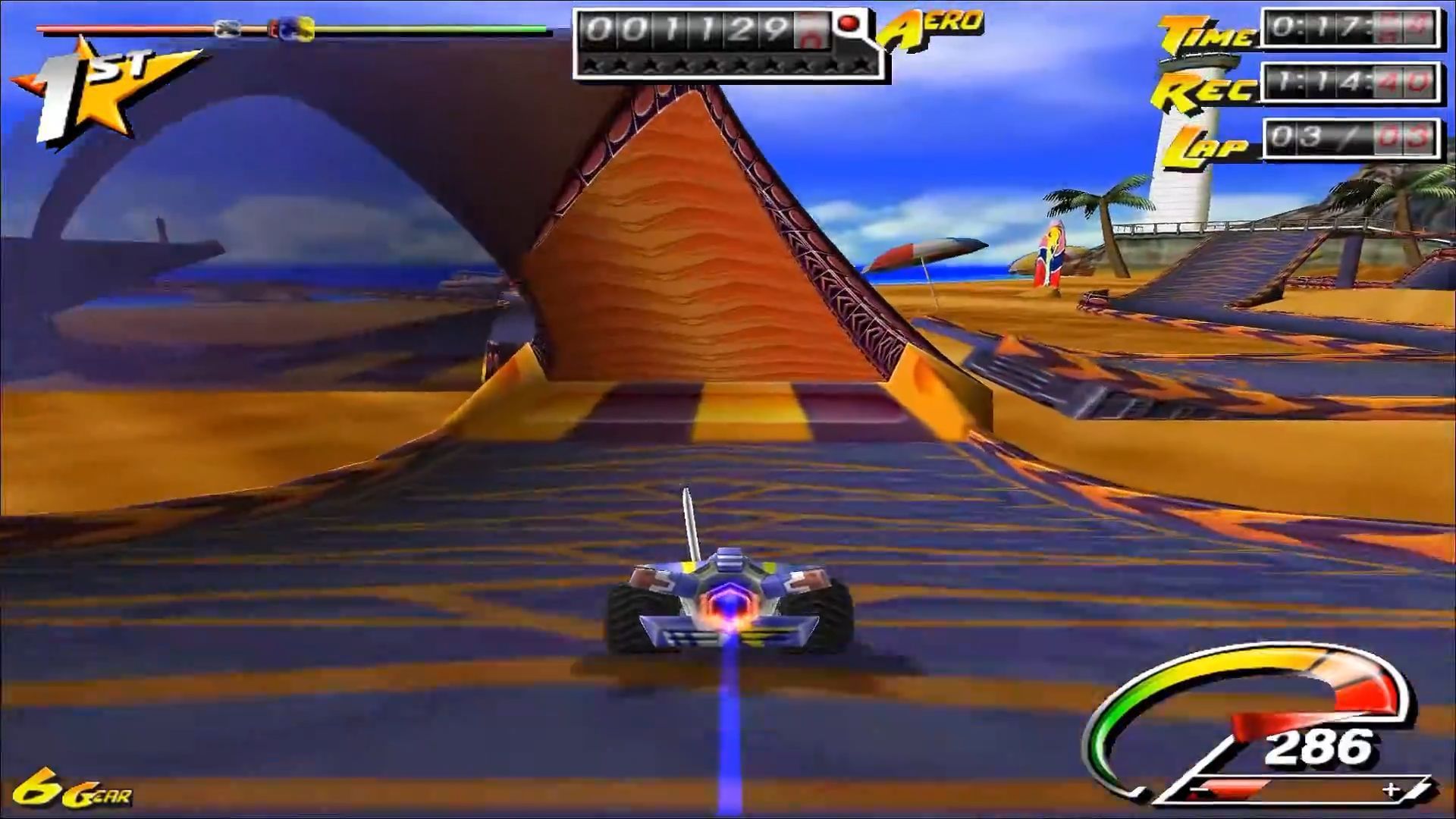 Druga opcja wiązała się z ryzykiem, ale bardziej nagradzała – mowa o akrobacjach, które stanowiły jedną z głównych atrakcji gry. Poprzez beczki i przewroty dokonane w locie. Raz, że nabijaliśmy punkty, a dwa, że nie wytracaliśmy prędkości – chyba że popis się nie udał i samochód wylądował na dachu. Liczyło się nasze wyczucie, jak i możliwości autka i przyznam, że przyjemnie podbijało to adrenalinę. Zwłaszcza że fizyka też pasowała do zabawowego tonu gry – przestrzelony wybryk potrafił katapultować nas z mapy, przez co mogliśmy zostać w tyle, a nadrabianie do łatwych nie należało (rubber banding, jeśli istniał, nie należał do przesadnie inwazyjnych, na ile pamiętam).