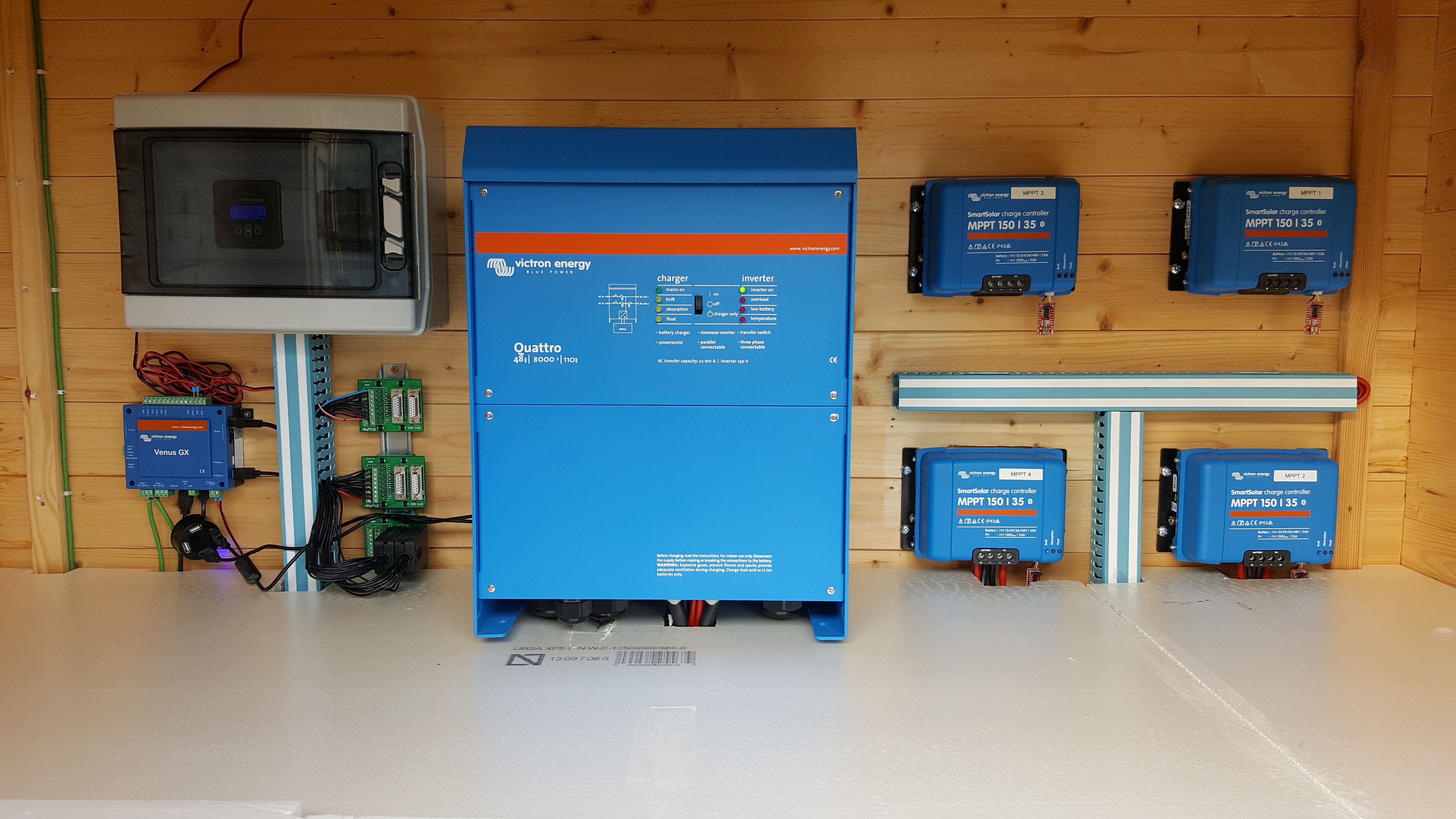 Kompletna instalacja systemu energetycznego Victron Energy, w tym centralny inwerter/ładowarka Quattro, regulatory ładowania MPPT dla paneli słonecznych oraz urządzenie zarządzające Venus GX.