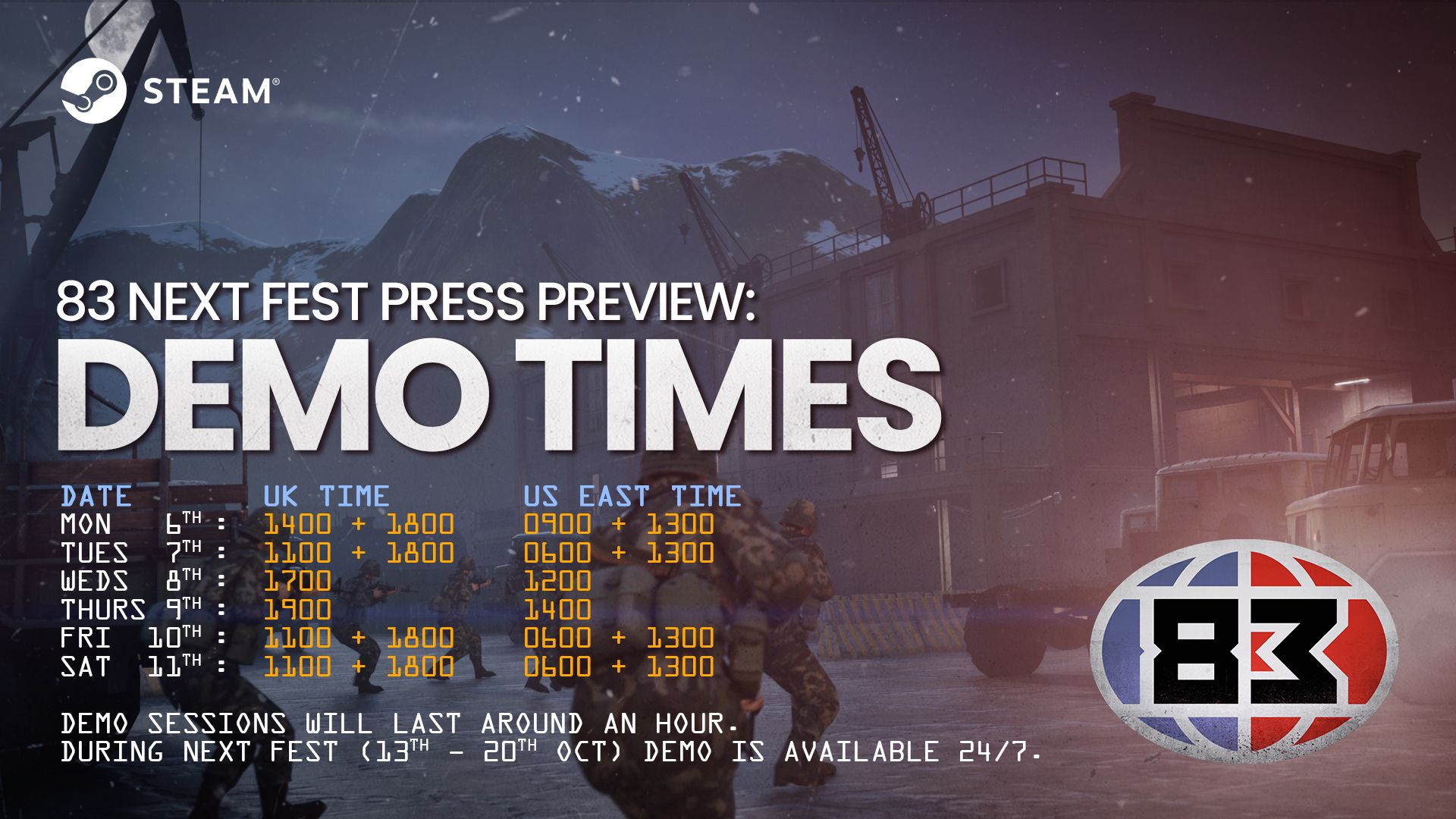 Na tydzień przed startem wydarzenia na platformie Valve twórcy zimnowojennego shootera postanowili dać szansę graczom na sprawdzenie rozgrywki. Jednak dostęp do niego jest limitowany – fani wypróbują '83 na Steamie od dziś (tj. 6 października) do 11 października w sesjach trwających około jedną godzinę. Poniżej znajdziecie rozpiskę opublikowaną przez studio. Co ważne, w trakcie Steam Next Fest demo będzie możliwe do ogrania bez żadnych przeszkód.