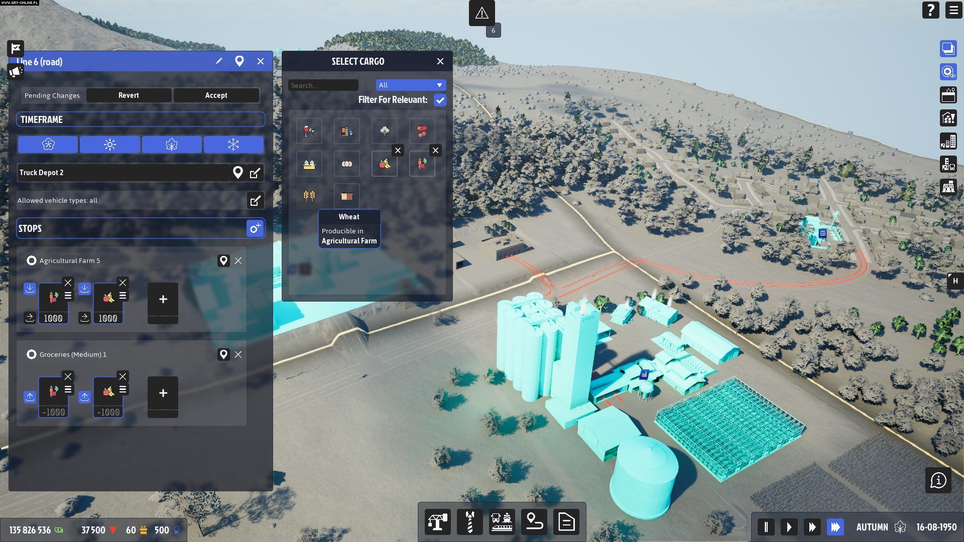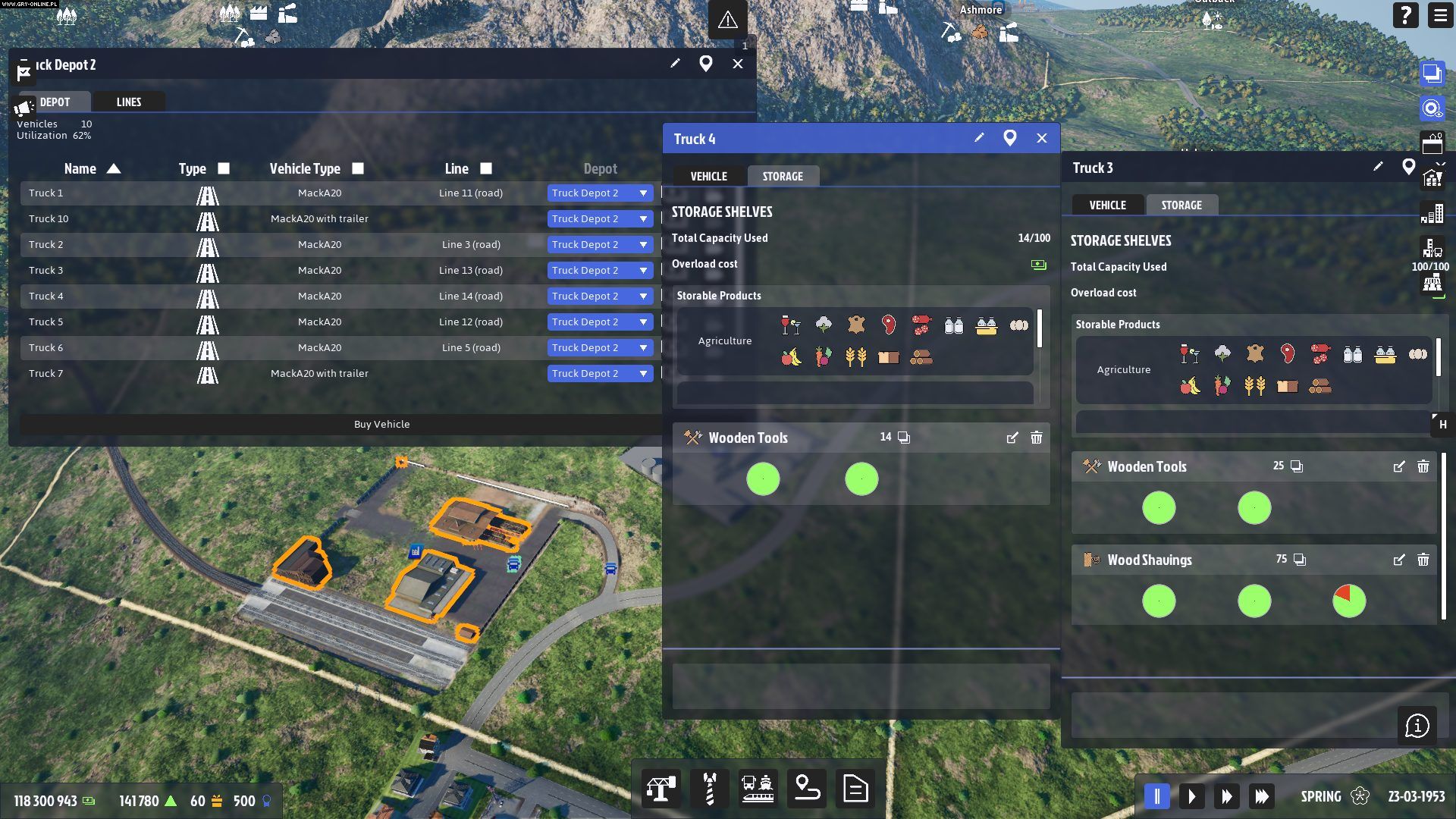 Kupując ciężarówki czy pociągi i tworząc linie transportowe, możemy zaznaczyć jakie dobra i pomiędzy jakimi punktami chcemy przewieźć. Możemy tworzyć dość skomplikowane trasy, a na poszczególnych przystankach ładować czy wyładowywać tylko niektóre z produktów. W praktyce jednak, zwłaszcza na początku, nie ma to większego sensu. Szybko okaże się, że transportowanych dóbr będzie na tyle dużo, iż w większości ciężarówki będą woziły tylko jeden produkt, bo pojedynczy ładunek to zaledwie ułamek potrzeb pracujących na pełnych obrotach fabryk.