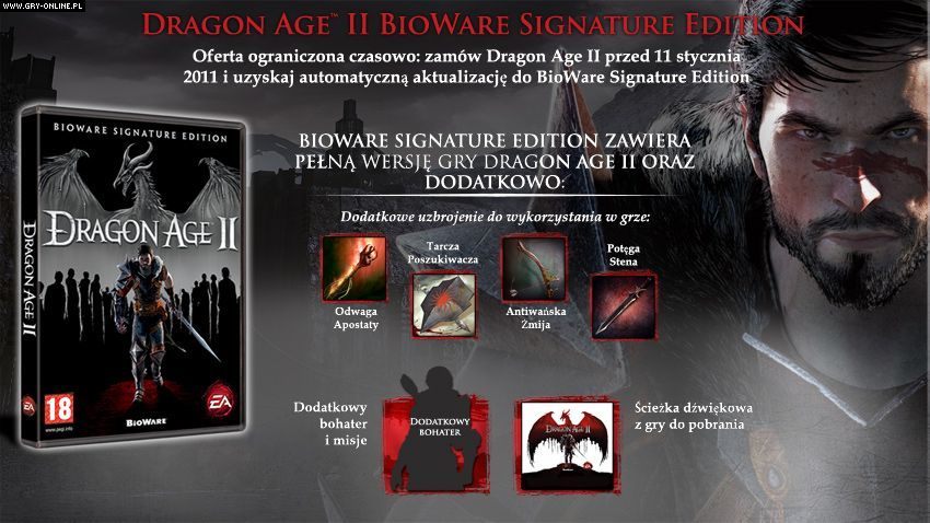Okazuje się, że każdy kto do 11 stycznia 2011 roku zamówi drugą część znanej produkcji cRPG, w dniu premiery otrzyma Dragon Age II Bioware Signature Edition. Jest to specjalne wydanie oprócz samej gry zawierające również kilka ciekawych atrakcji o łącznej wartości kilkudziesięciu złotych.