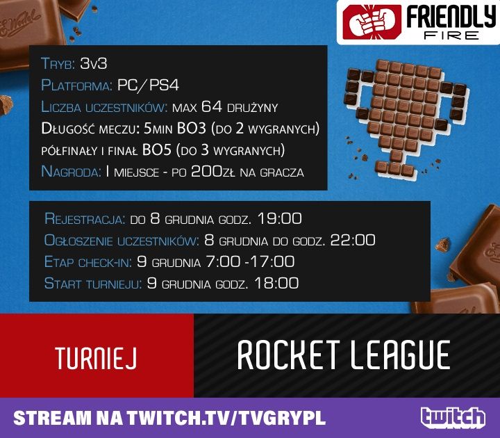Zbliża się koniec obecnego sezonu Friendly Fire by Wedel Up!. Przed nami jeszcze dwa turnieje, w których do wygrania będą standardowo nagrody pieniężne oraz zestawy słodkości od marki E.Wedel. 9 grudnia o godzinie 18:00 odbędą się rozgrywki 3v3 w grze Rocket League. Rejestrować możecie się pod tym adresem od teraz do 8 grudnia, godziny 19:00. Listę uczestników ogłosimy w ten sam dzień o godzinie 22:00. Następnego dnia (tj. 9 grudnia) zawodnicy będą musieli potwierdzić swój udział w godzinach 7:00 – 17:00.