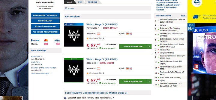 Sklepy handlujące grami wideo mają to do siebie, że często spieszą się z dodawaniem do swoich ofert jeszcze niezapowiedzianych produkcji. Choć nie brakuje zwyczajnych pomyłek, zazwyczaj takie „wycieki” są niedługo później potwierdzane przez wydawców (jak miało to miejsce choćby w przypadku gry RAGE 2). Istnieje szansa, że podobny los spotka trzecią odsłonę cyklu Watch Dogs, która pojawiła się na liście produktów sprzedawanych przez austriacki Gameware.