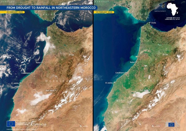 Gdyby w lutym 2025 roku ktoś spojrzał z orbity na Maroko to zobaczyłby kraj, w którym dominuje kolor czerwony ze względu na wysuszoną i odwodnioną glebę. W połowie lutego 2026 roku zakończyły się jednak opady deszczu, które od około dwóch miesięcy nawiedzały kraj i w znacznym stopniu zmieniły jego krajobraz. Najlepiej pokazuje to satelita Copernicus Sentinel-3.