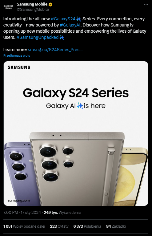 17 stycznia 2024 roku Samsung ogłosił nową serię produktów rodziny Galaxy. Smartfony wyposażone w sztuczną inteligencję mają stać się, między innymi, mobilnym studiem fotograficznym. Dotyczy to również obrazów uchwyconych z poziomu Instagrama, Snapchata, WhatsApp oraz TikToka.