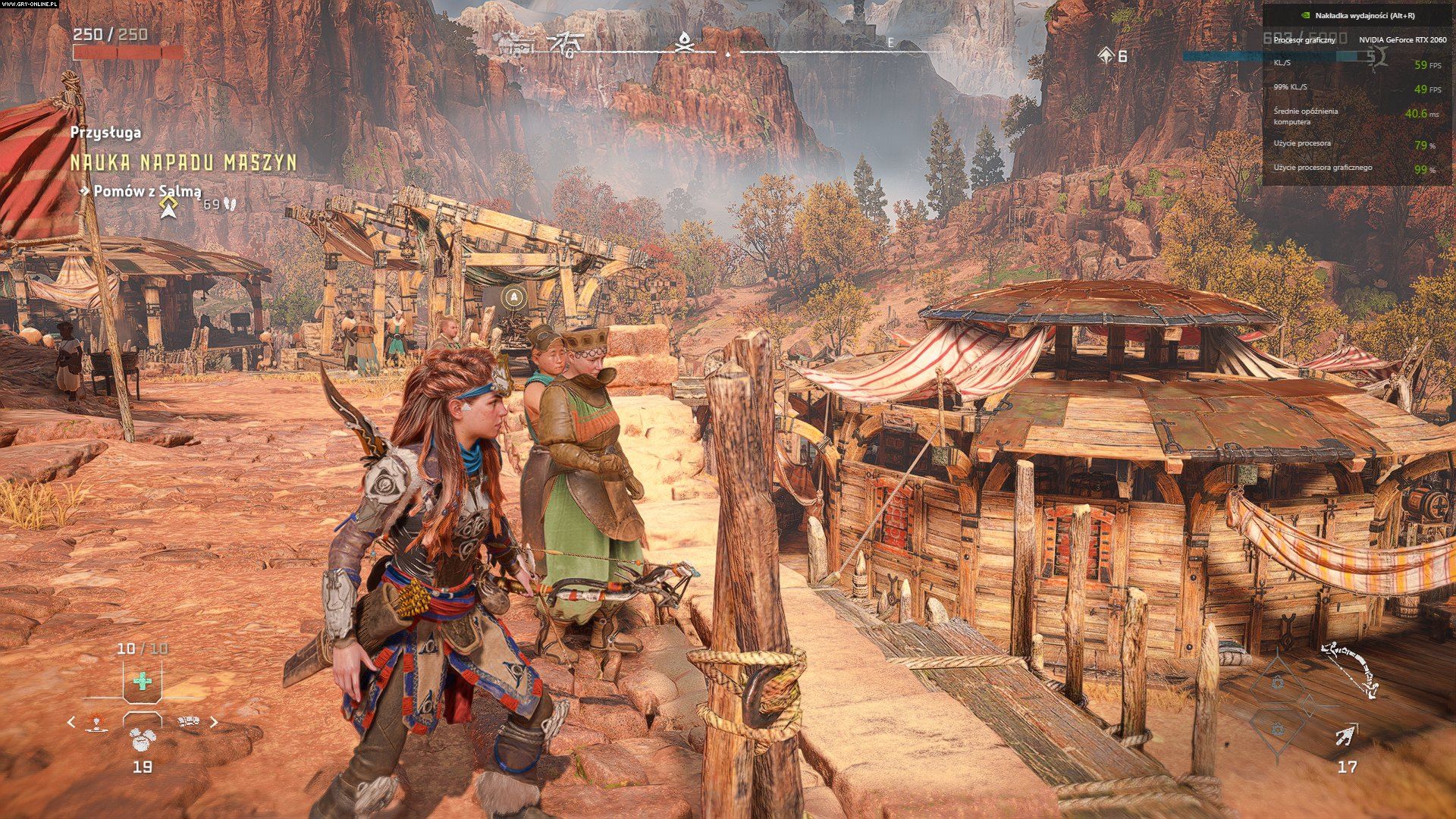 Testując różne ustawienia na swoim komputerze, warto pamiętać, żeby robić to w lokacji ze sporą liczbą ludzi. W jednej z pierwszych osad, Złomiankach, zauważyłem wyraźne spadki klatek w miejscu, z którego zobaczycie sporo zrzutów ekranu poniżej. W porównaniu do pobliskich lasów i walki z kilkoma maszynami, Złomianki wymagały właściwie zejścia o jedno ustawienie graficzne w dół, by utrzymać podobne wartości klatek, zwłaszcza na słabszych komputerach.