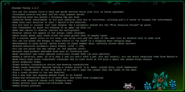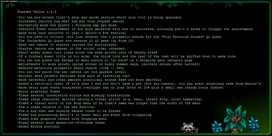 Poza dodaniem portretu Krobusa oraz zmiany, którą Eric „ConcernedApe” Barone zdradził wcześniej jako teaser aktualizacji, aktualizacja 1.6.3 to przede wszystkim poprawki powiązane z różnymi nowinami dodanymi w ostatnim wielkim uaktualnieniu (via serwis X).