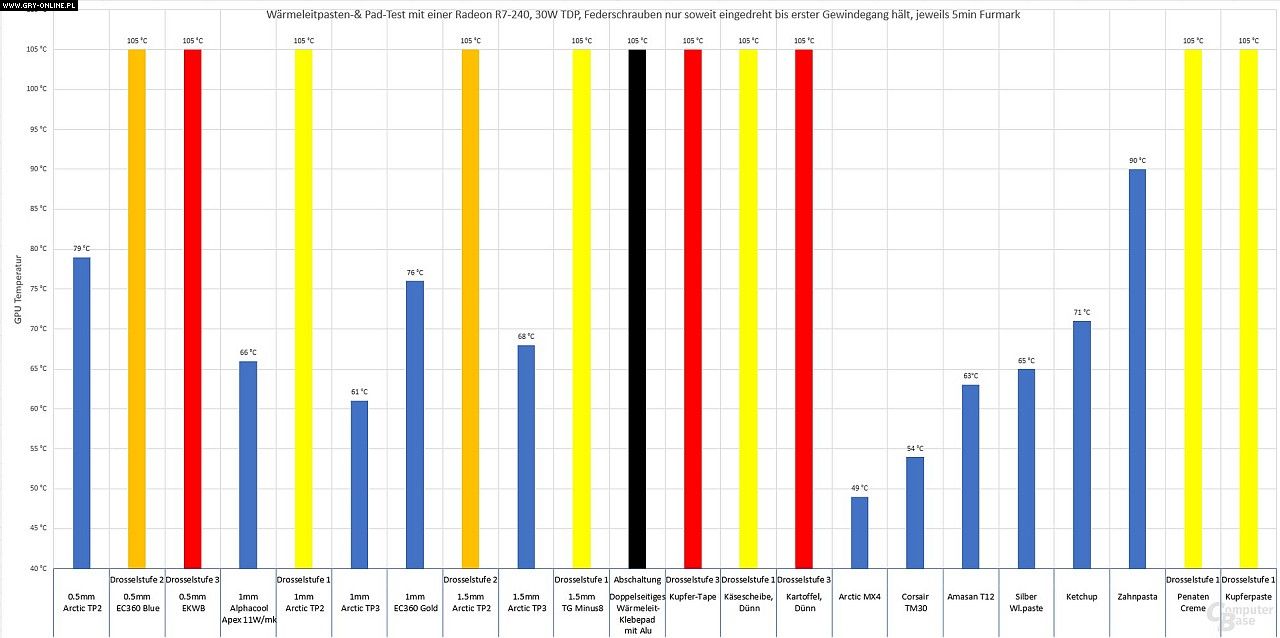 W tym niecodziennym teście zainspirowanym dyskusją na forum porównano pasty termoprzewodzące takich firm jak Arctic czy Corsair z właściwościami termoprzewodzącymi ziemniaków, plastrów sera, ketchupu i pasty do zębów. Do testów „poświęcono” niezbyt drogie urządzenie – kartę graficzną Radeon R7 240.