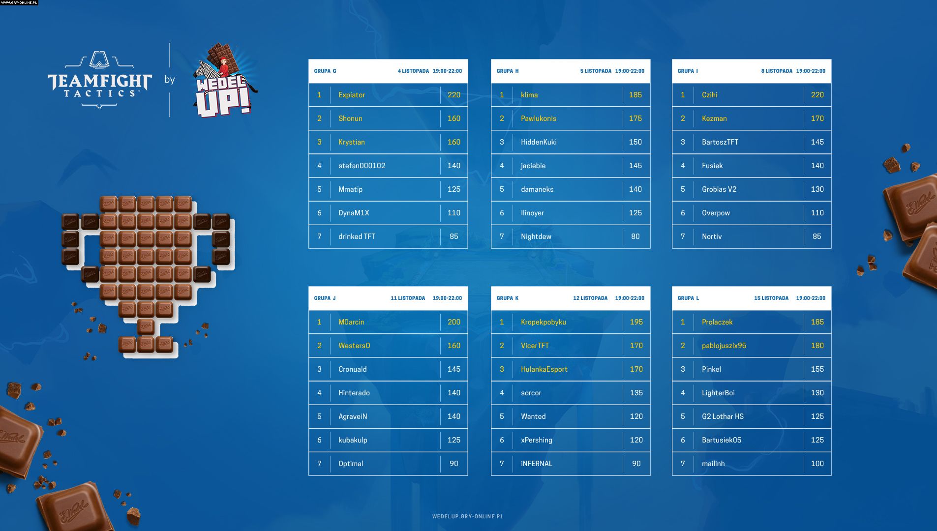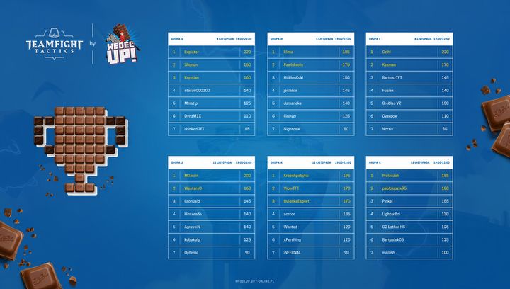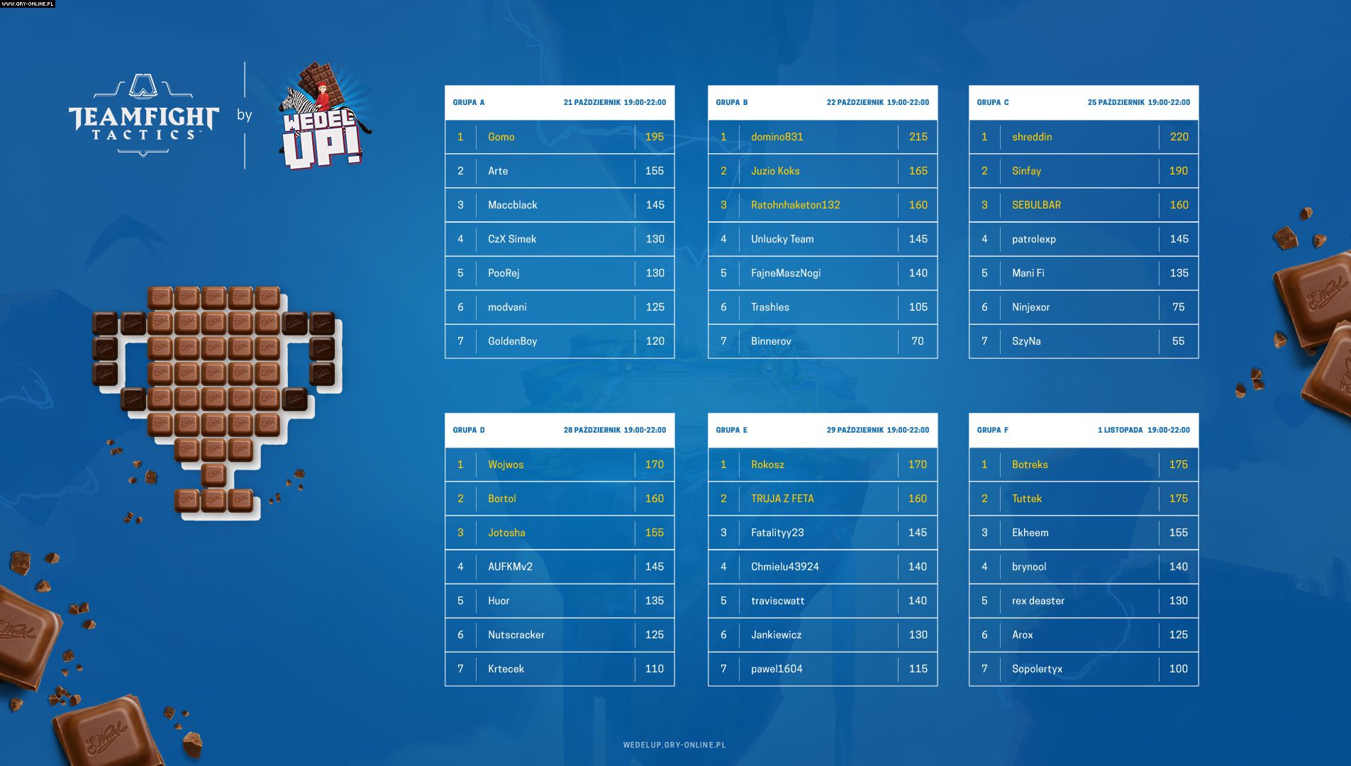 W zeszłym tygodniu odbyły się ostatnie mecze fazy grupowej turnieju Teamfight Tactics CUP by Wedel Up!. Poznaliśmy 28 zawodników, którym udało się zakwalifikować do dalszego etapu. Pierwsi z nich już w ten weekend powalczą o awans do półfinałów, kolejne nagrody pieniężne oraz zestawy słodkości od marki E.Wedel.