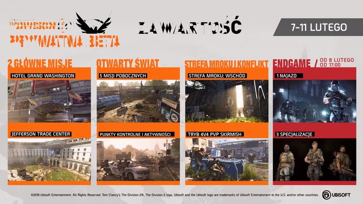 W dniach 7-11 lutego odbędą się zamknięte (prywatne) beta-testy najnowszej sieciowej strzelanki od firmy Ubisoft – Tom Clancy’s The Division 2. Deweloper poinformował dziś, co dokładnie zostanie udostępnione graczom biorącym udział w tym wydarzeniu. Okazuje się, że nadarzy się okazja do sprawdzenia zarówno początkowych misji, jak i tzw. zawartości end game.