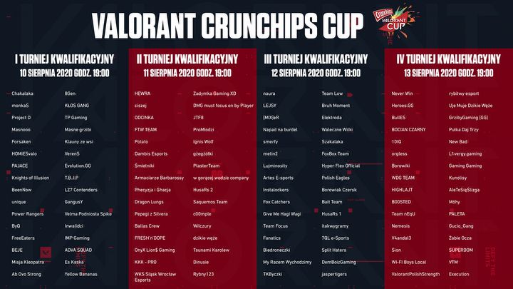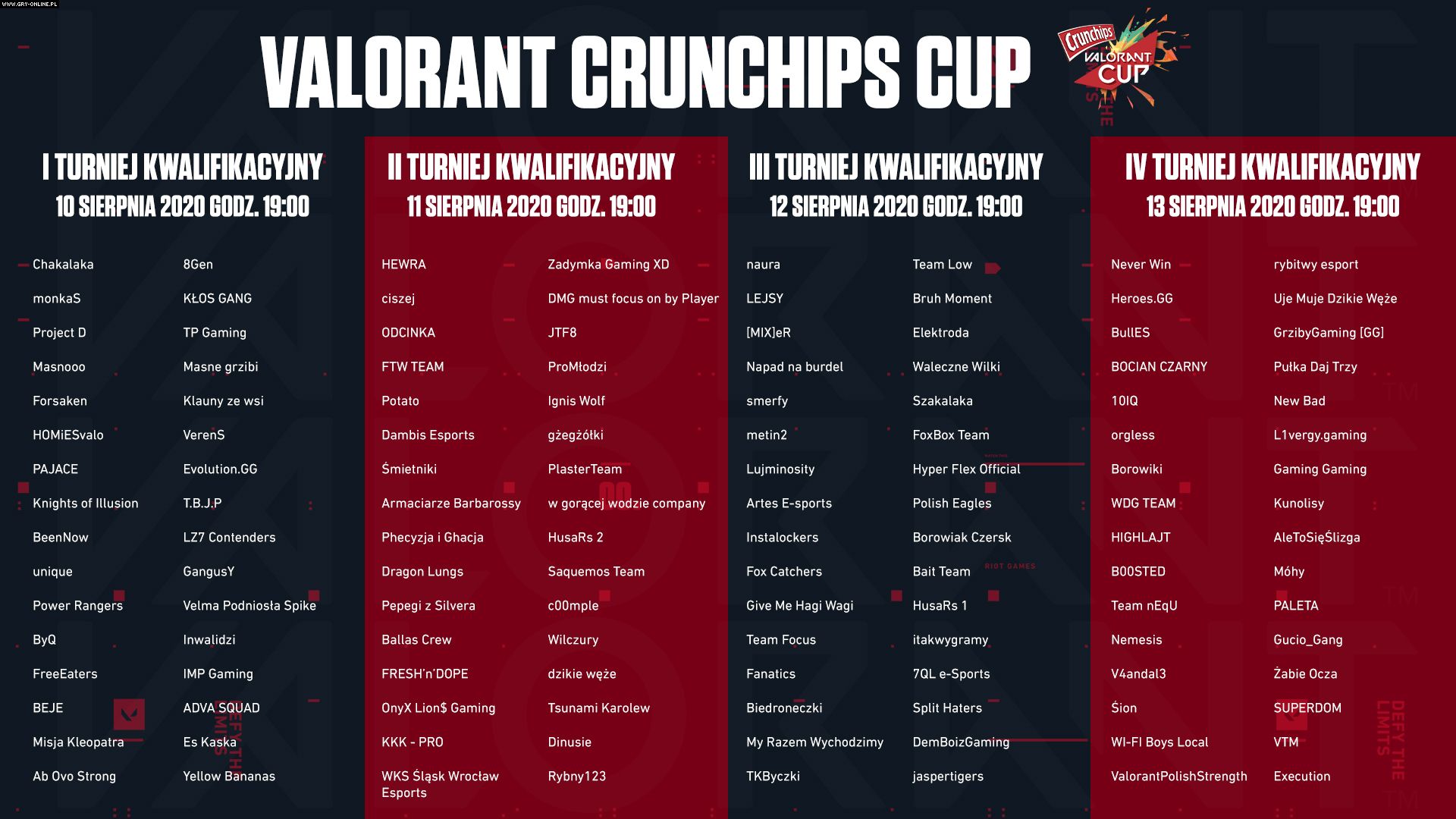 Kilka dni temu zakończyły się zapisy do otwartych kwalifikacji do turnieju VALORANT CRUNCHIPS CUP, który organizujemy dla Was jako ekipa Friendly Fire wraz z marką Crunchips oraz firmą Riot Games. Dzięki temu poznaliśmy drużyny, które już w przyszłym tygodniu zmierzą się o awans do fazy grupowej rozgrywek. Pełną listę zakwalifikowanych zespołów prezentujemy Wam na grafice poniżej. Wszystkie drużyny mają szansę zawalczyć o nagrody z puli 17 500 zł oraz miesięczny zapas Crunchips - jest granie, jest chrupanie! Dziękujemy wszystkim za zainteresowanie – zgłosiło się ponad 180 ekip, z czego jesteśmy niesamowicie zadowoleni!