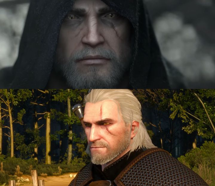 Na górze: pierwsza grafika z trailera z 2013 roku. Niżej: faktyczny wygląd Geralta z gry z 2015 roku.CD Projekt Red