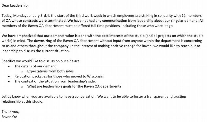 Od 6 grudnia w Raven Software trwa strajk pracowników działu kontroli jakości. Wynika on z faktu, że 12 testerów zostało zwolnionych. Po trzech tygodniach od rozpoczęcia protestu osoby biorące w nim udział postanowiły wystosować pismo do kierownictwa Activision Blizzard.