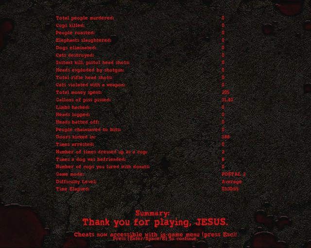 Okazuje się jednak, że w tym szaleństwie jest metoda, a nawet czeka na Was nietypowa gratyfikacja! Jeśli uda się Wam przejść Postala 2 w taki właśnie sposób, zostaniecie nagrodzeni informacją: „Dzięki za grę, JEZUSIE”. Ze względu na owo wyróżnienie tryb pacyfistyczny w tej grze ochrzczono mianem „Jesus Runa”. Jestem zdumiony, że deweloperzy wzięli w ogóle taką opcję pod uwagę.