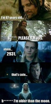 Do gustu bardzo przypadł mi też mem, w którym poszczególne postacie mówią o swoim wieku. Frodo ma pięćdziesiątkę, Aragorn ponad osiemdziesiątkę, Legolas kilkaset lat na karku, a Galadriela, cóż, wystarczająco dużo, by wyrobić sobie spojrzenie o mocy choinkowych lampek!